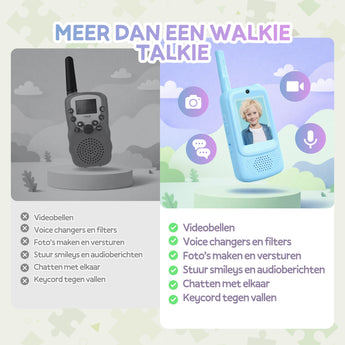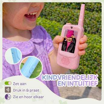 Live beeld en geluid, bereik tot +400 meter, USB-C oplaadbaar, voice changer met grappige stemmen, én stevig ontwerp voor actief spel! Deze walkie talkie voor kinderen met video is hét speelgoed waarmee kinderen elkaar zien én horen tijdens hun eigen missies door het hele huis of de tuin.